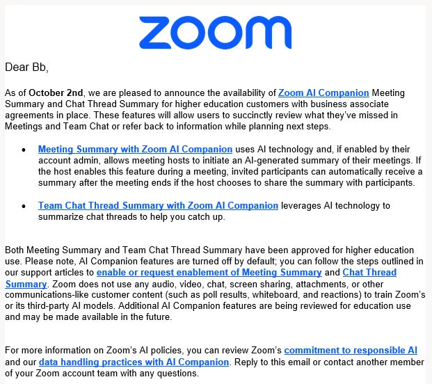 We are interested in enabling AI Companion at the admin level for our institution (higher education). However, we want more information on how AI Companion collects info from meetings, chats, and recordings. Will Zoom share that info with third-party tools? How to ensure FERPA and HIPPA compliance? Thank you!