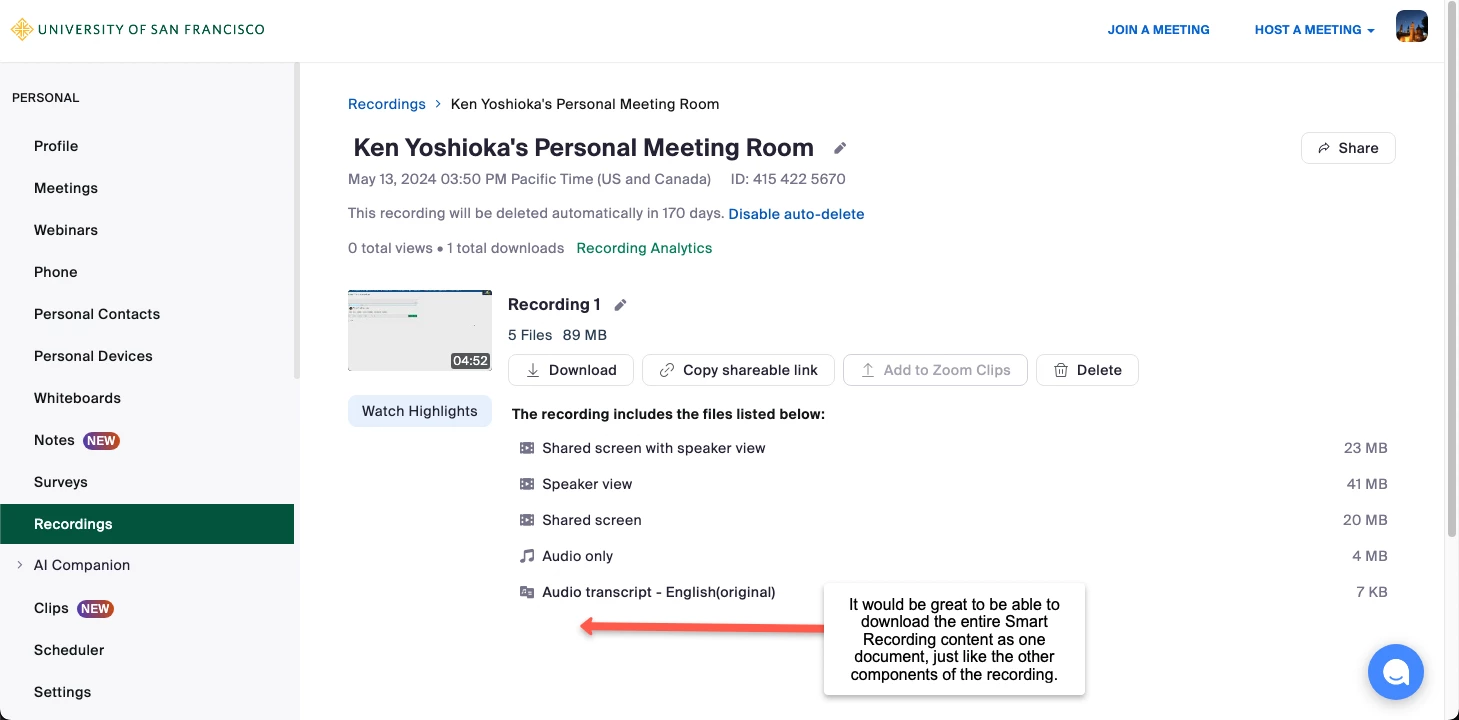 Not sure if this has been discussed before but the AI Companion Smart recordings are a game changer for staff tasked with creating minutes from meetings as well as students and faculty conducting research interviews on Zoom. The Smart recording content, however, is not one of the components that can be downloaded from the cloud recording like the video and the transcript. Is Zoom going to add that functionality?