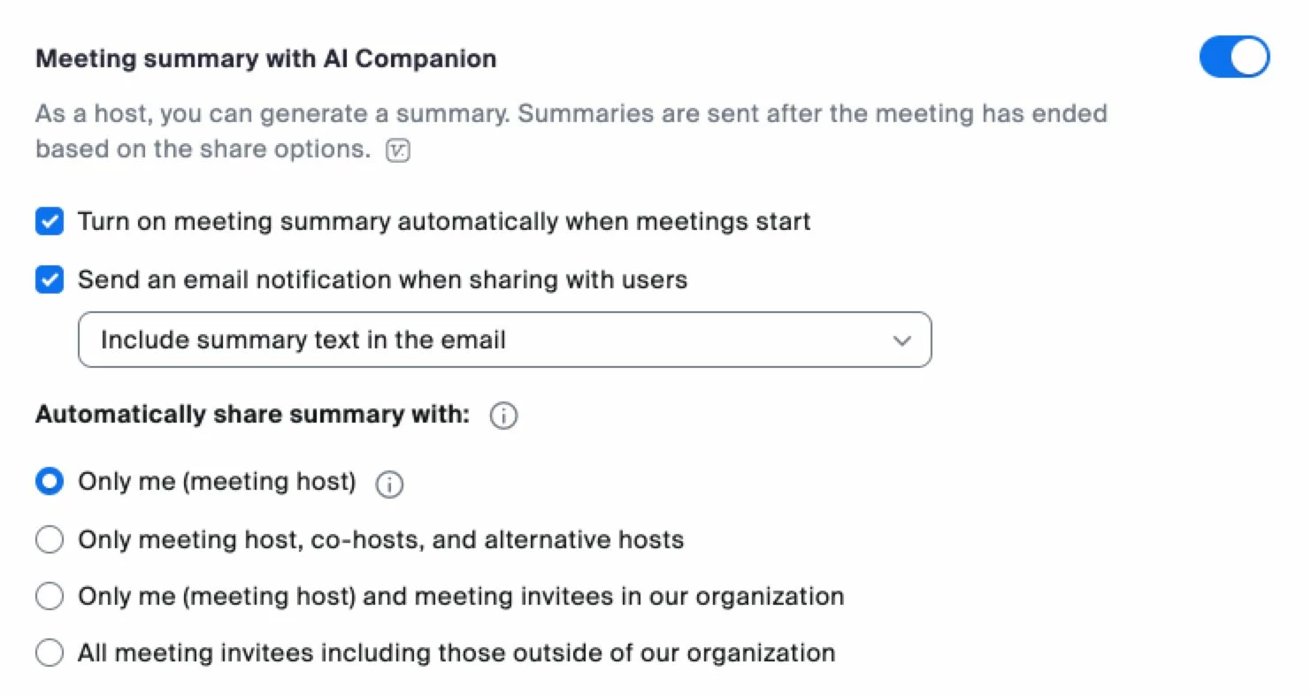 I have a Workplace Pro account. It says I have access to AI Companion. When I set up a meeting a meeting, I select the meeting summary option under Advanced, I think. However, so far I have not been able to locate the summaries. I also record the videos and can find them.