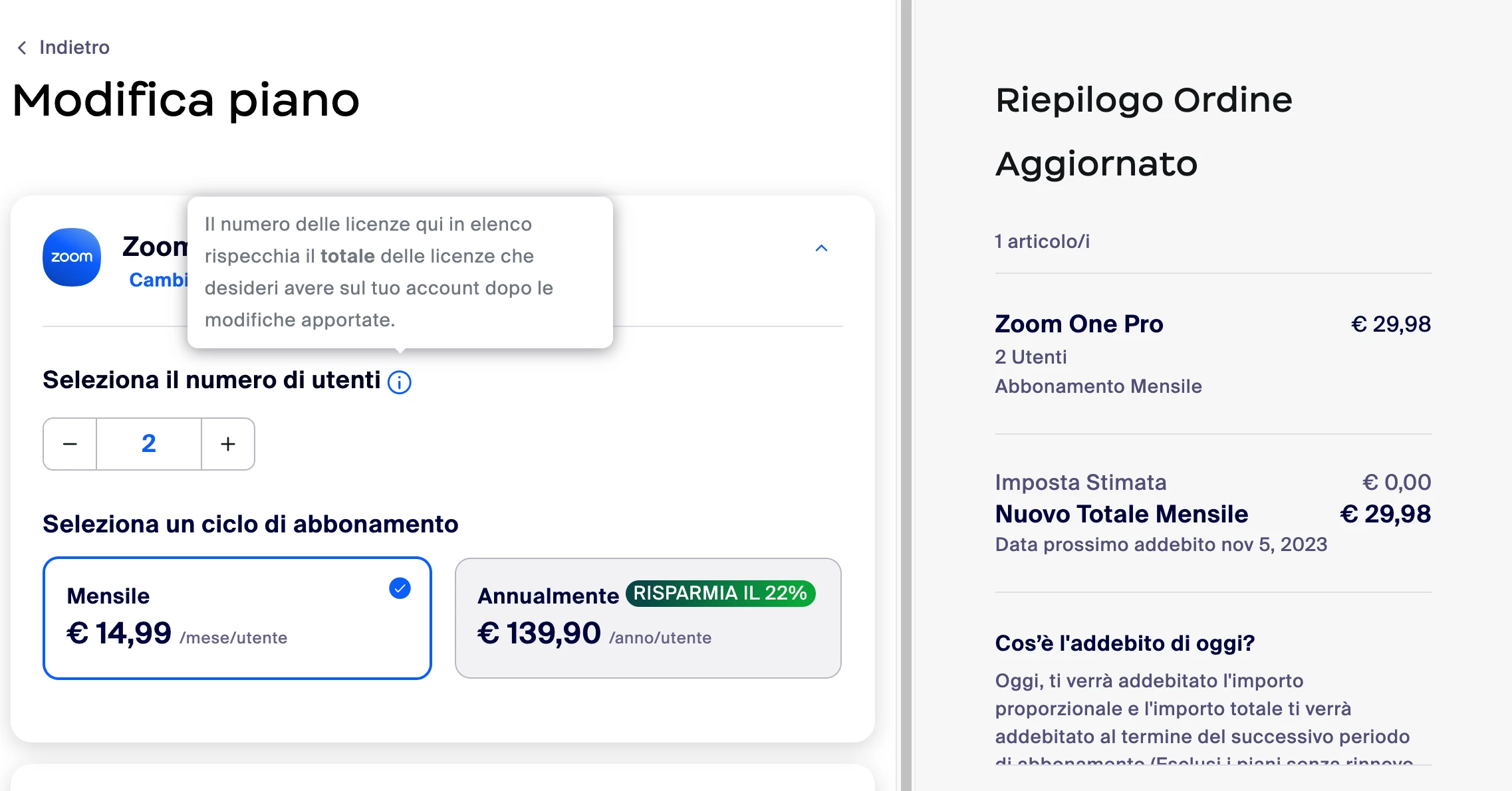 ho una licenza Zoom Pro con abbonamento annuale per un solo utente. Ho bisogno di aggiungere un secondo utente con licenza perché mi serve un organizzatore alternativo per una riunione: andando ad acquistare un'altra licenza posso selezionarne due mensili ma vorrei essere sicura che questo non cambi il mio piano di abbonamento annuale. Qualcuno può darmi conferma che è la cosa giusta da fare? Altrimenti come posso fare? Grazie