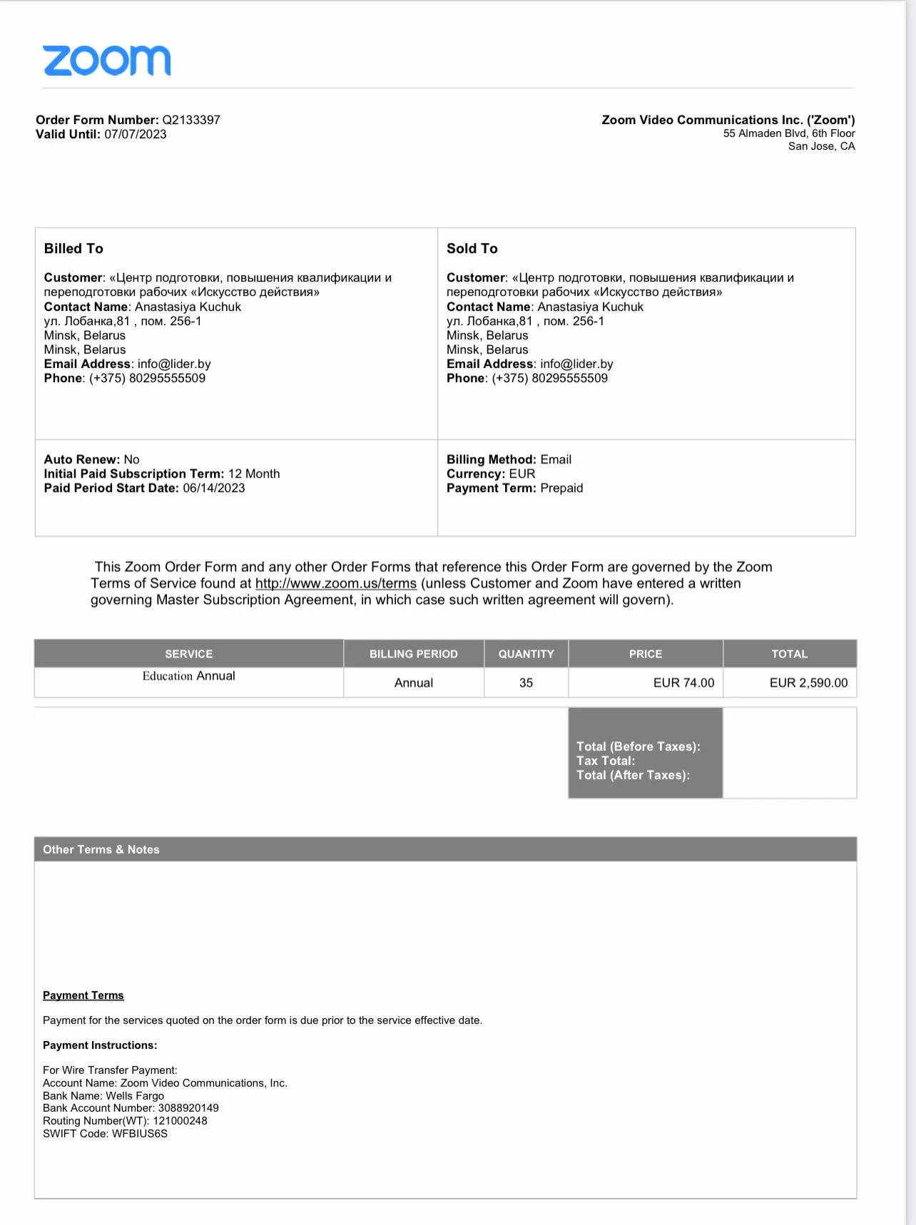Our subscription was cancelled due to a Zoom system mistake. We had a pending overdue invoice that we didn't know about. We paid the total amount that was in the invoice. And the quote we received didn't include VAT tax. So we paid the exact amount and our service was enabled. Now all our teachers are suffering due to your own system bug in the quote that you sent to us. We were not supposed to have any pending invoices in place.