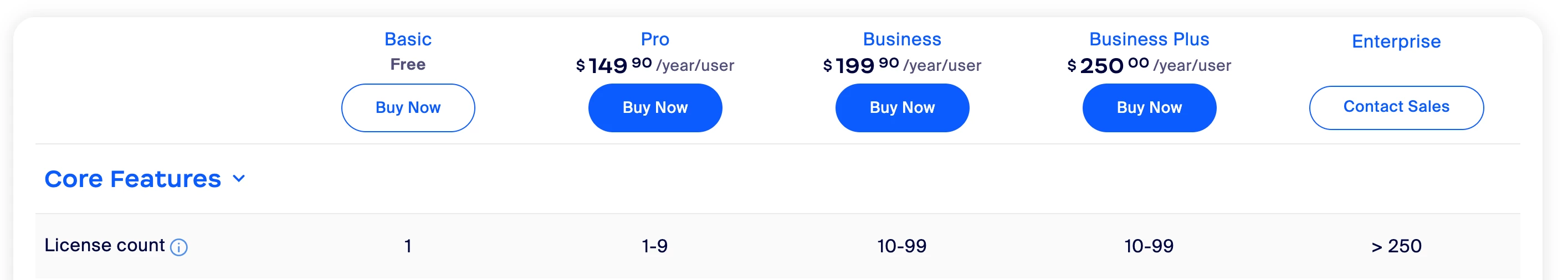 How many licensed users are allowed on each plan (Basic, pro, Business)