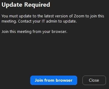 I have been using the Zoom app on my personal device just fine for the past two years. I only have one user (Myself) on the desktop. I use zoom to access meetings for my Coding Bootcamp and my online courses at my university. It refuses to allow me to join via the desktop app for the past couple of weeks and will only allow me to join in the browser (which has been also been giving me issues). It states "You must update to the latest version of Zoom to join this meeting. Contact your IT admin to update. Join this meeting from your browser". After uninstalling it and reinstalling it, its only bringing my computer to version 5.12.2. If I run the installer as Administrator and sign in via google it states "Your app version needs to be 5.12.2 or higher to sign in. Please contact you IT team to update your app".