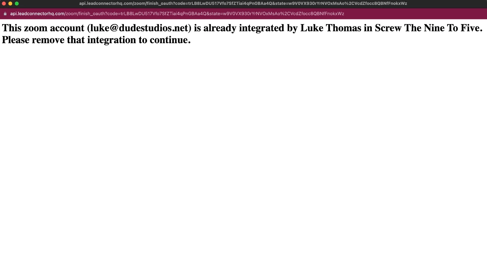 I'm trying to connect my zoom account to a new GoHighLevel account with a client but it will not let me as it's saying it's connected to an old clients one (see screenshot).