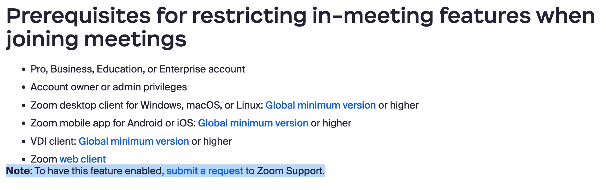 While we might not be able to do away with the feature enablement request process entirely, one small courtesy that we can request of Zoom is to comprehensively list all features that can be manually enabled on the back-end by request, as to simplify the process. Please write to your support teams if this is something that interests/affects you and your users!!
