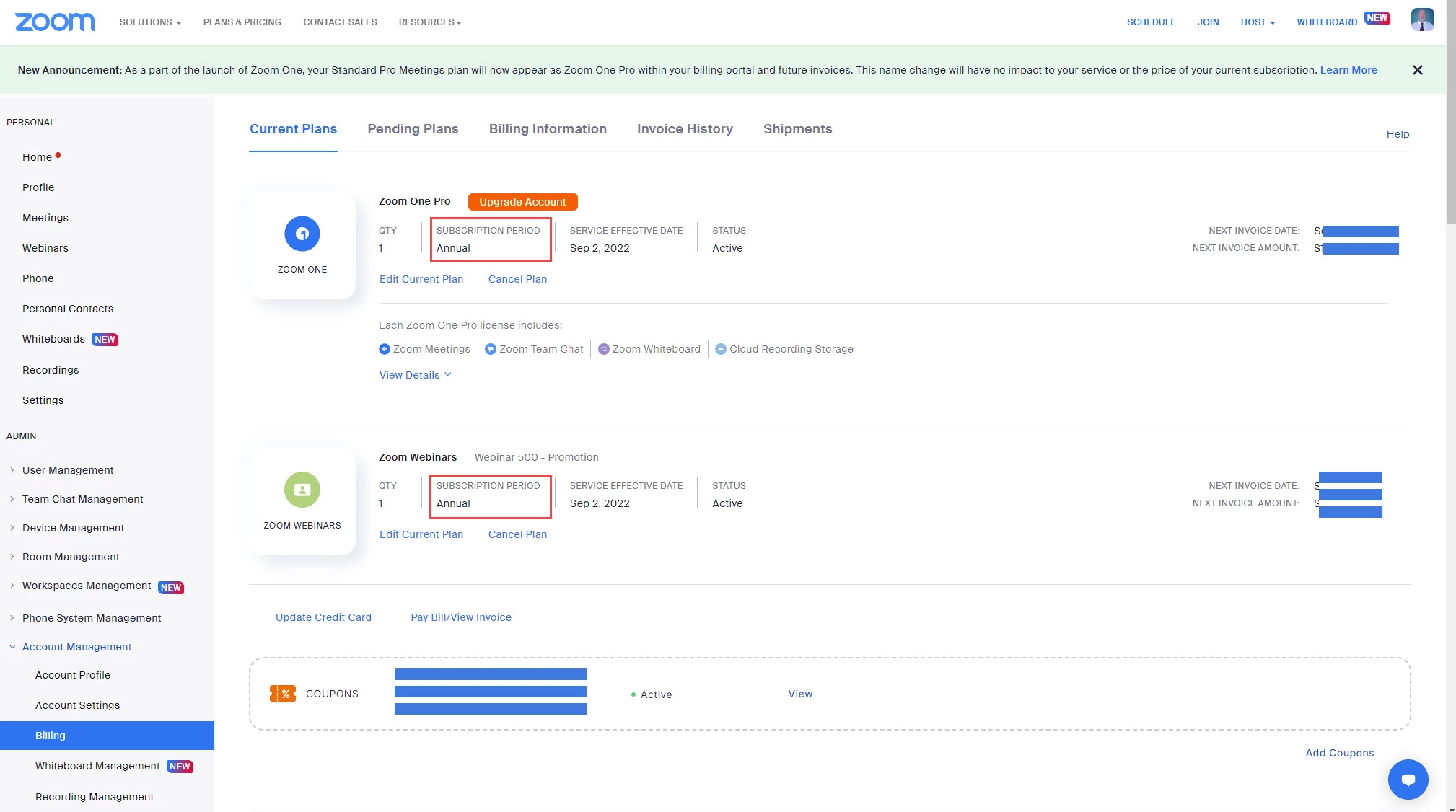 I was having trouble taking advantage of the 40% off annual plan offer directly, so I figured that I had to sign up for a regular monthly plan first. I did that and paid for a month of Zoom One. Then, I almost immediately paid to upgrade to an annual plan, which processed and seemed to work correctly. I've paid for the year, but when I look on my Account, it seems I'm still on the monthly plan? Will this update? How can I make sure my annual plan takes effect, given that I've paid for it and that's what I want?