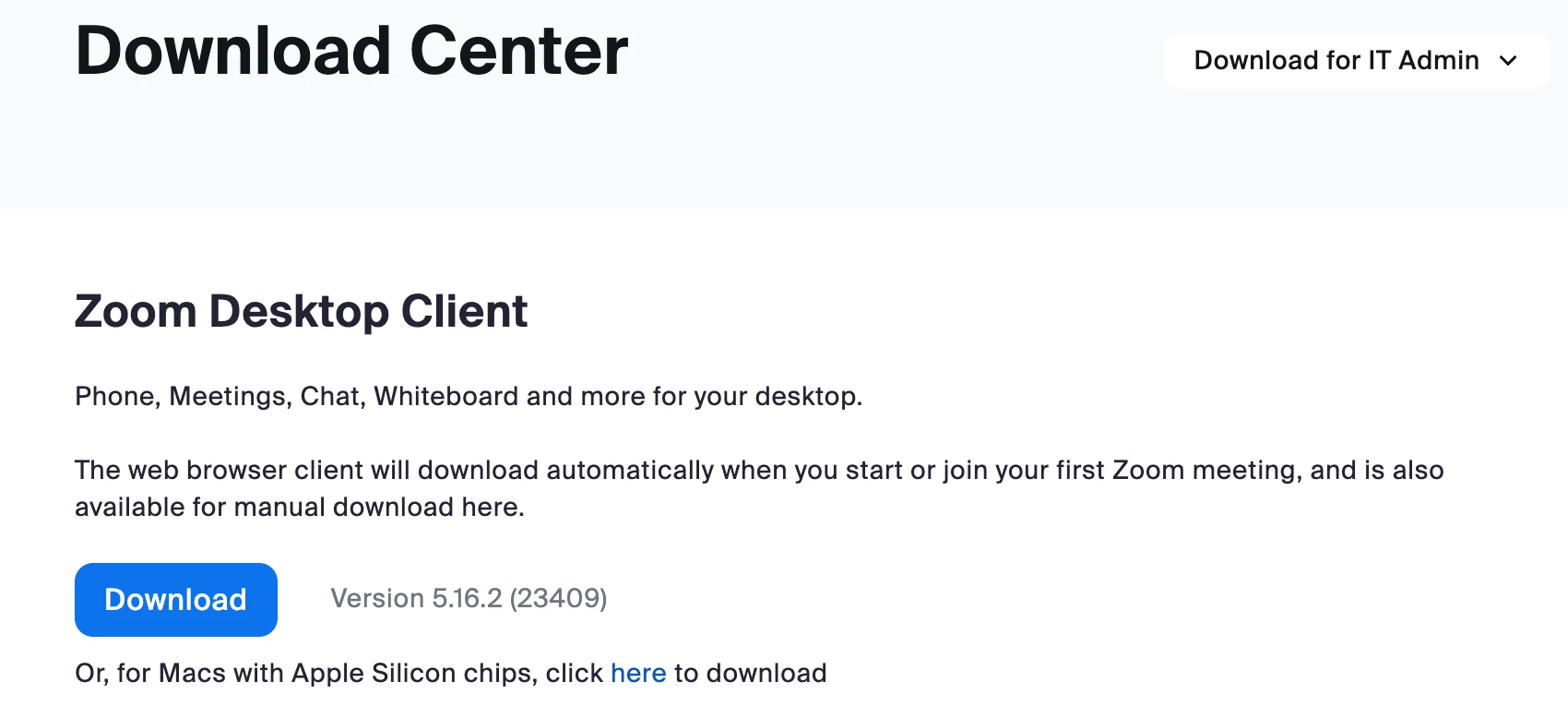 - Zoom Desktop Client (Version 5.16.2 (23409)) (107mb - Apple Silicon)