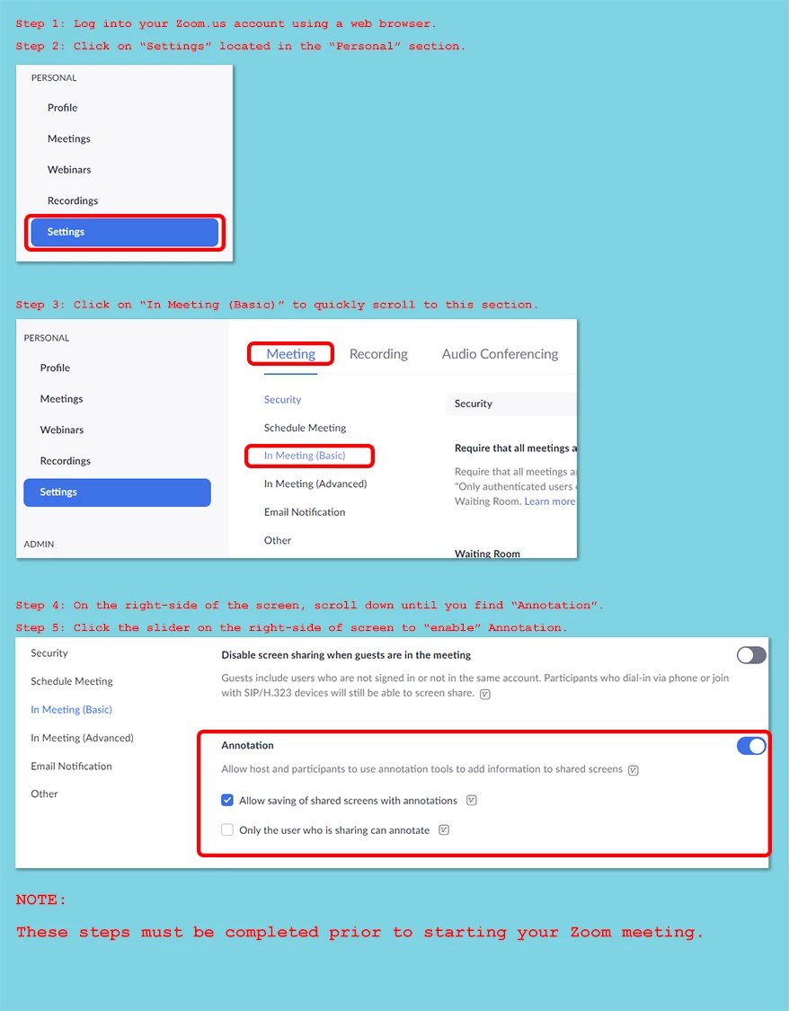 I need to record a timed Zoom session in order to secure a virtual teaching position. One of the requirements of the session is to use the annotate function. I cannot figure out how to turn that on. I have read the directions on the Zoon sight as well as some Googled instructions. They were the same and they don't work-- they are wrong. For starters after logging in, the directions are to go to Account Management and then Account Settings but Account Settings isn't under Management. If I play around with it, I can find "Settings" without "management", but then it's impossible to find the 3rd direction which is to Click the Meeting Tab. These directions just don't go anywhere. Help!