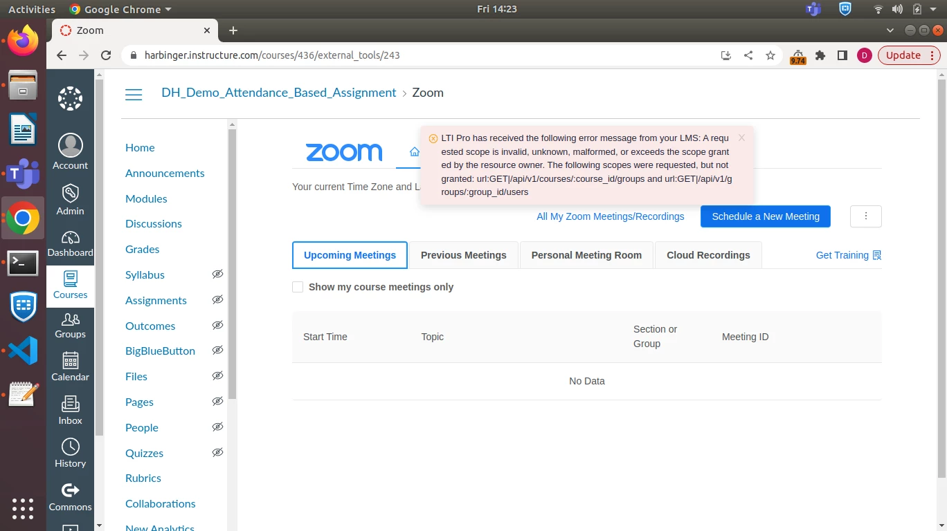 GghanshyamNewcomerForum|Forum|2 years agoApril 28, 2023Configuring LTI Pro 1.1 for Canvas Calendar and ConversationsForum|Forum|2 years agoApril 28, 20231 reply1 viewHi Team,I have followed as per the given all steps to Configuring LTI Pro 1.1 for Canvas Calendar and Conversations. But it's giving an error and when I create a meeting it is not showing on the Canvas dashboard calendar.