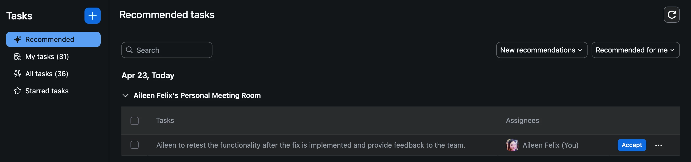 If you chat with a colleague about a project update, and they mention, "I’ll send you the draft by the end of the day", Zoom Tasks can detect the task from the chat and adds a reminder to follow up on the draft. You can assign this task to yourself or set a due date to ensure it gets done.