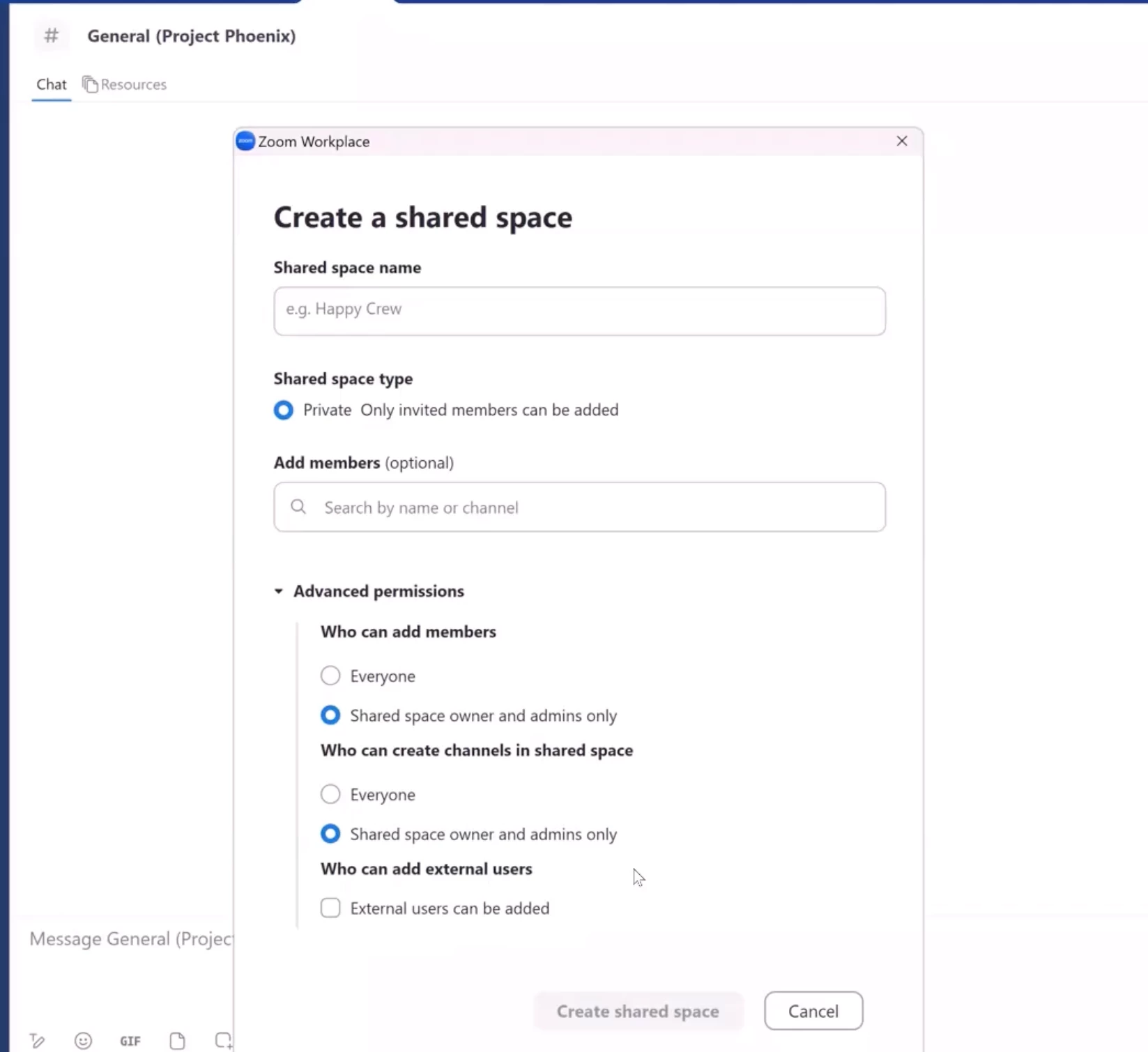 For end-users, creating a Shared Space is similar to creating a channel, with options for naming, adding members, and setting permissions. Easily manage members and add existing or new channels directly within the Shared Space.