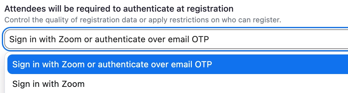 We're trying to get started on Zoom Webinars and want users to register but don't want them to have to enter One Time Passwords (OTP).