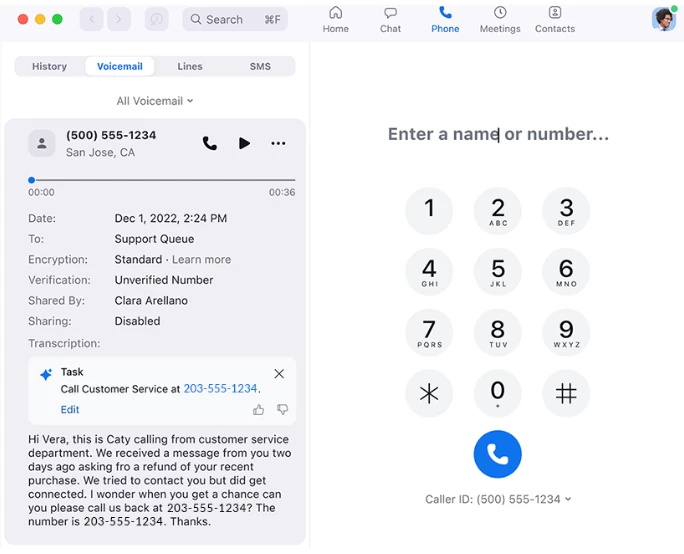 Extract Voicemail Tasks: AI Companion analyzes the transcribed voicemail message to identify actionable items mentioned in the voicemail. If tasks were identified, AI Companion creates a list of tasks directly within the voicemail interface.