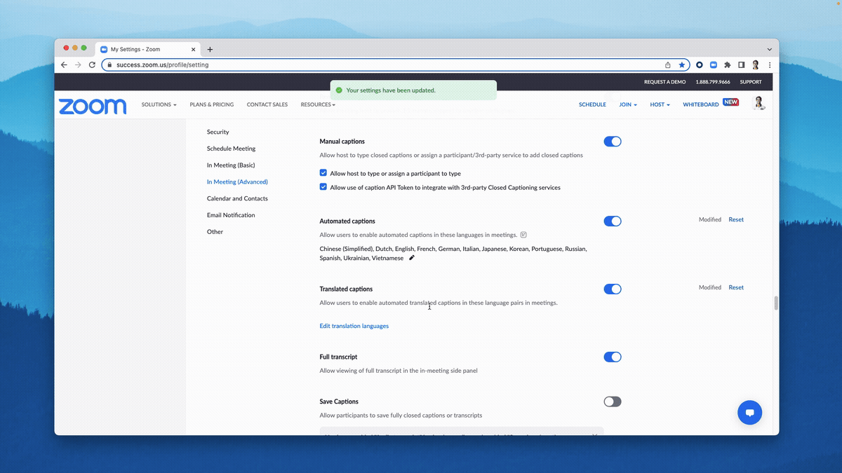 Enable the Feature and Select Languages: Translated captions are simple to enable within the Zoom web portal. Once enabled, just set your preferred languages.