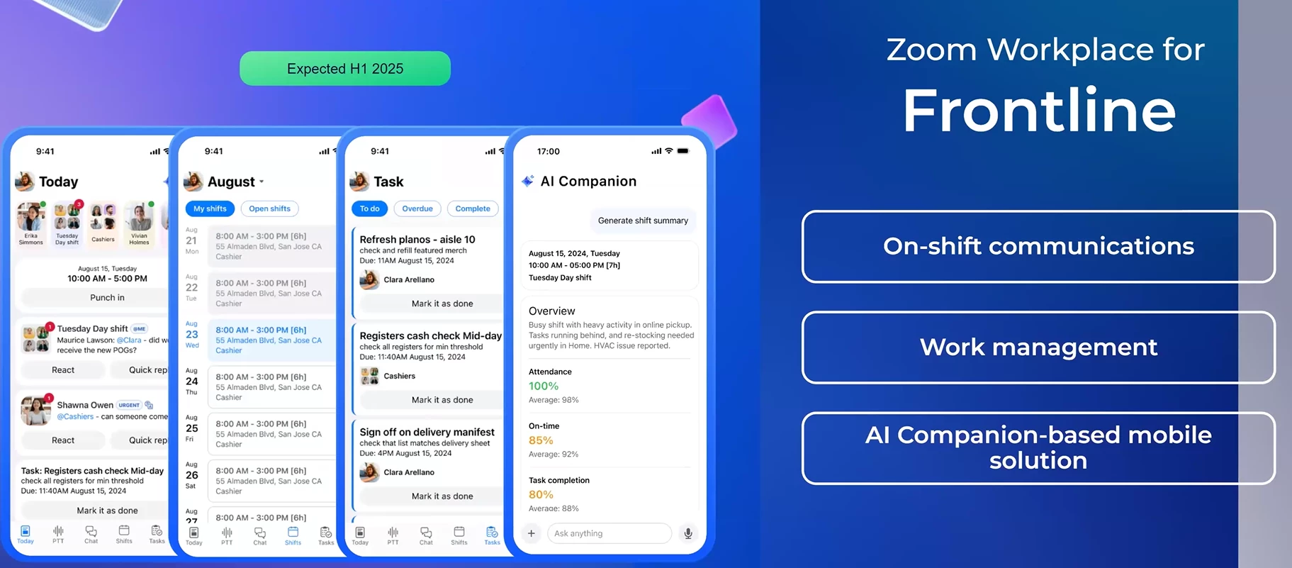 Zoom Workplace for Frontline is a mobile-first solution tailored for industries like retail, healthcare, and manufacturing, where frontline workers need efficient on-shift communication and task management tools. Key features include auto-generated shift-based chat groups, real-time activity feeds, shift swapping, and task tracking—all accessible via the mobile app. The integration of AI Companion provides automated shift summaries and smart search capabilities, streamlining daily operations.