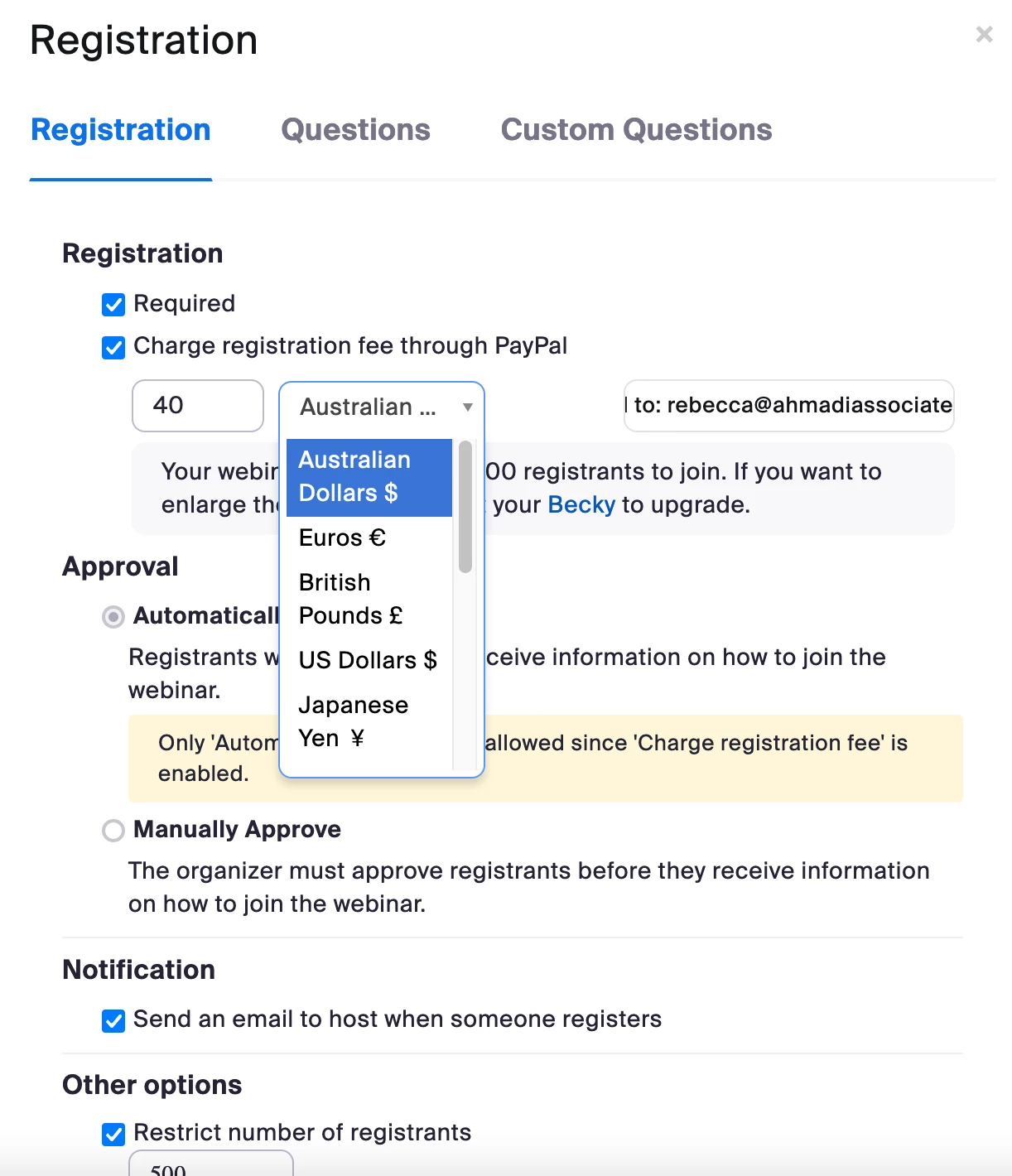 Rebecca8NewcomerForum|Forum|2 years agoApril 16, 2023QuestionChanging the currency on a registration pageForum|Forum|2 years agoApril 16, 20230 replies0 viewsHI everyone....I have attached a screenshot of my problems- I need my currency to be in New Zealand $ not the pre-populated 5 choices that are not NZ$. How can I change the pre-populated list - is this a zoom thing or is it a PayPal thing?Help 🙂Registration page