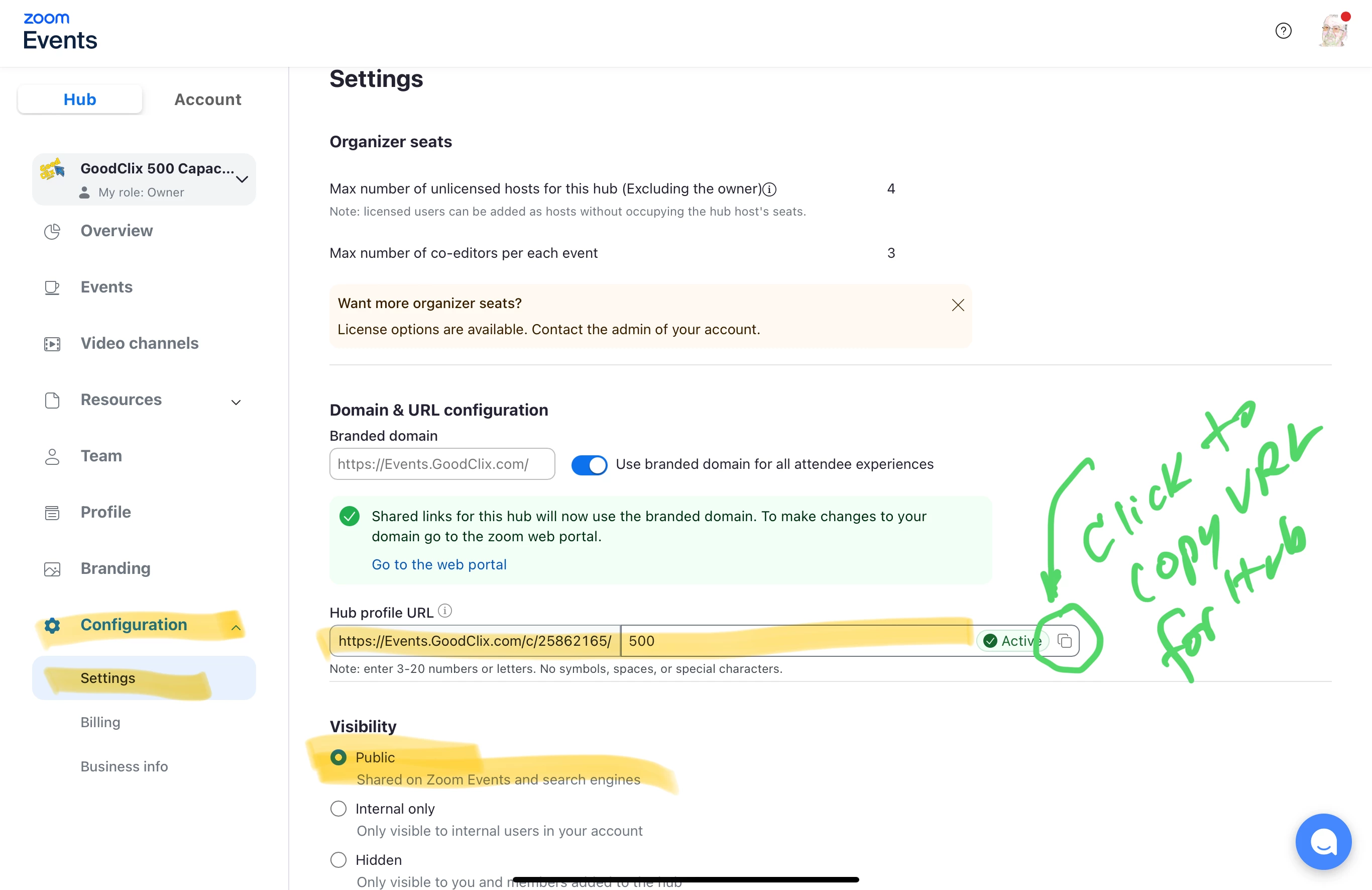 How do I find out what the URL to my zoom events hub is? I want to link to it from my website...