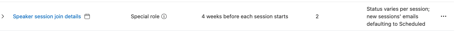 The speaker session join details email is scheduled for 4 weeks out - but sessions start next week.