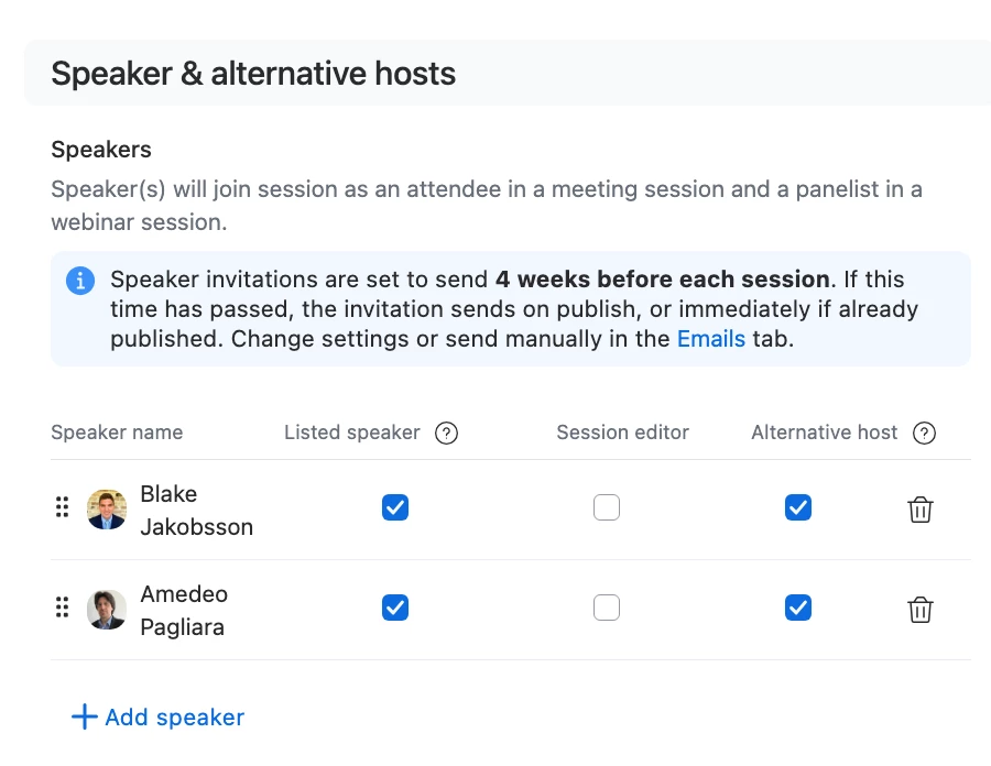 Hi - I’ve just published a recurring weekly event. We will have different team members covering sessions, so I didn’t have any speakers added when I published.