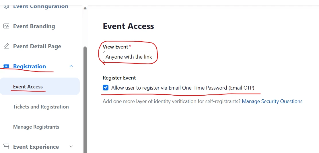 Also - I thought there was now a way to have attendees register without having to login to their zoom accounts first? As far as I can tell I have checked all the boxes - please advise as I am still getting sent to sign in when I am attempting to test with my testing email (not my ZE email)