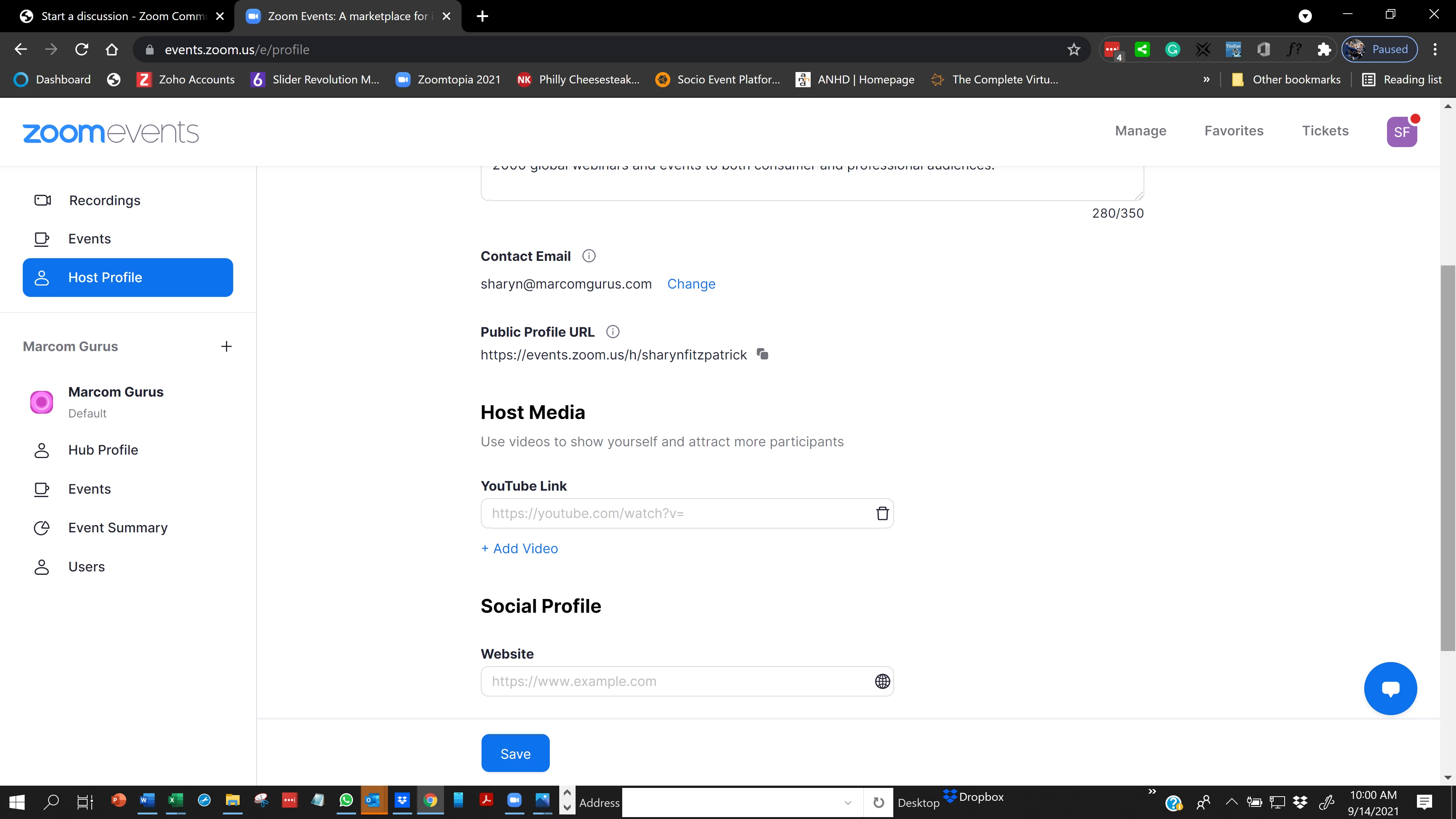 I have a Zoom Events question - and Support has no clue - I wanted to set up my Zoom Host profile. When I select "+Add video", the only video upload link is for a YouTube portfolio. My portfolio is on my Vimeo channel and my website. How can I add them with YouTube being the only option?