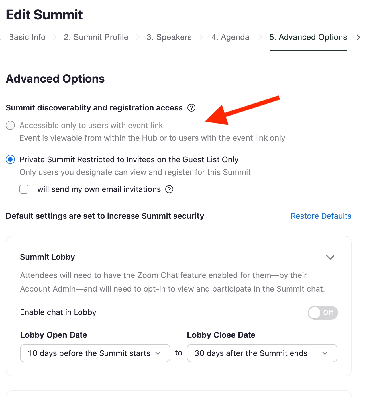 After creating an event in Zoom Events. I cannot set my event to "Accessible only to users with event link"