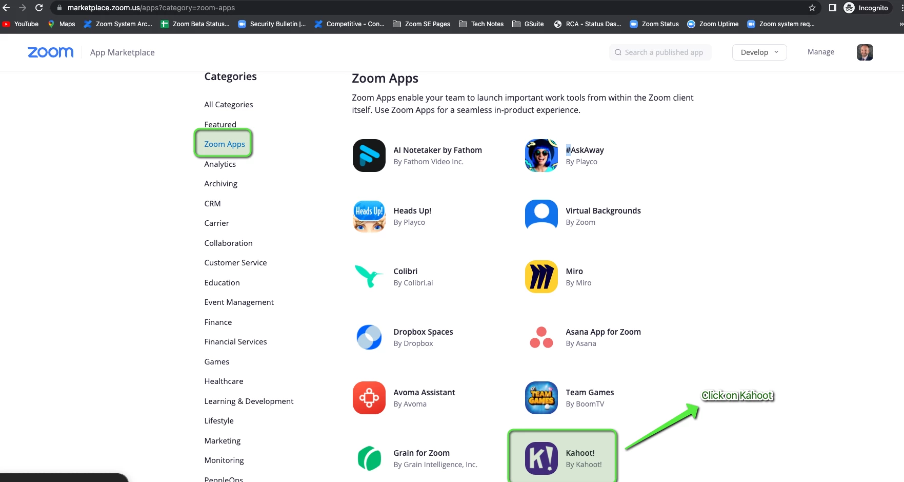 I can open Kahoot in Zoom after having selected it from the list of apps.