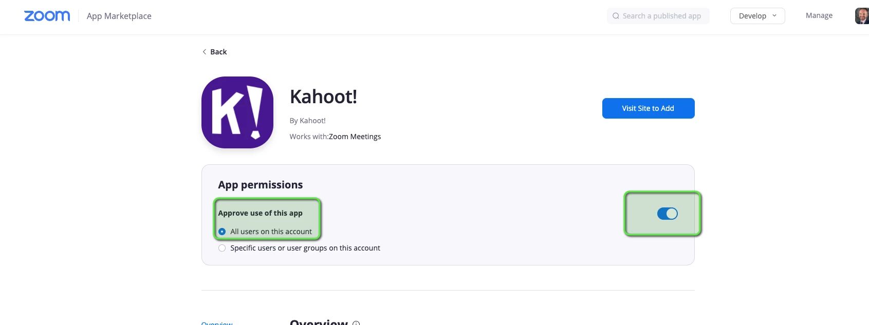 I am using my own paid zoom account but when trying to add apps (Kahoot and others) I need to click the pre approval button and thus approval from my "admin". Who is that admin?