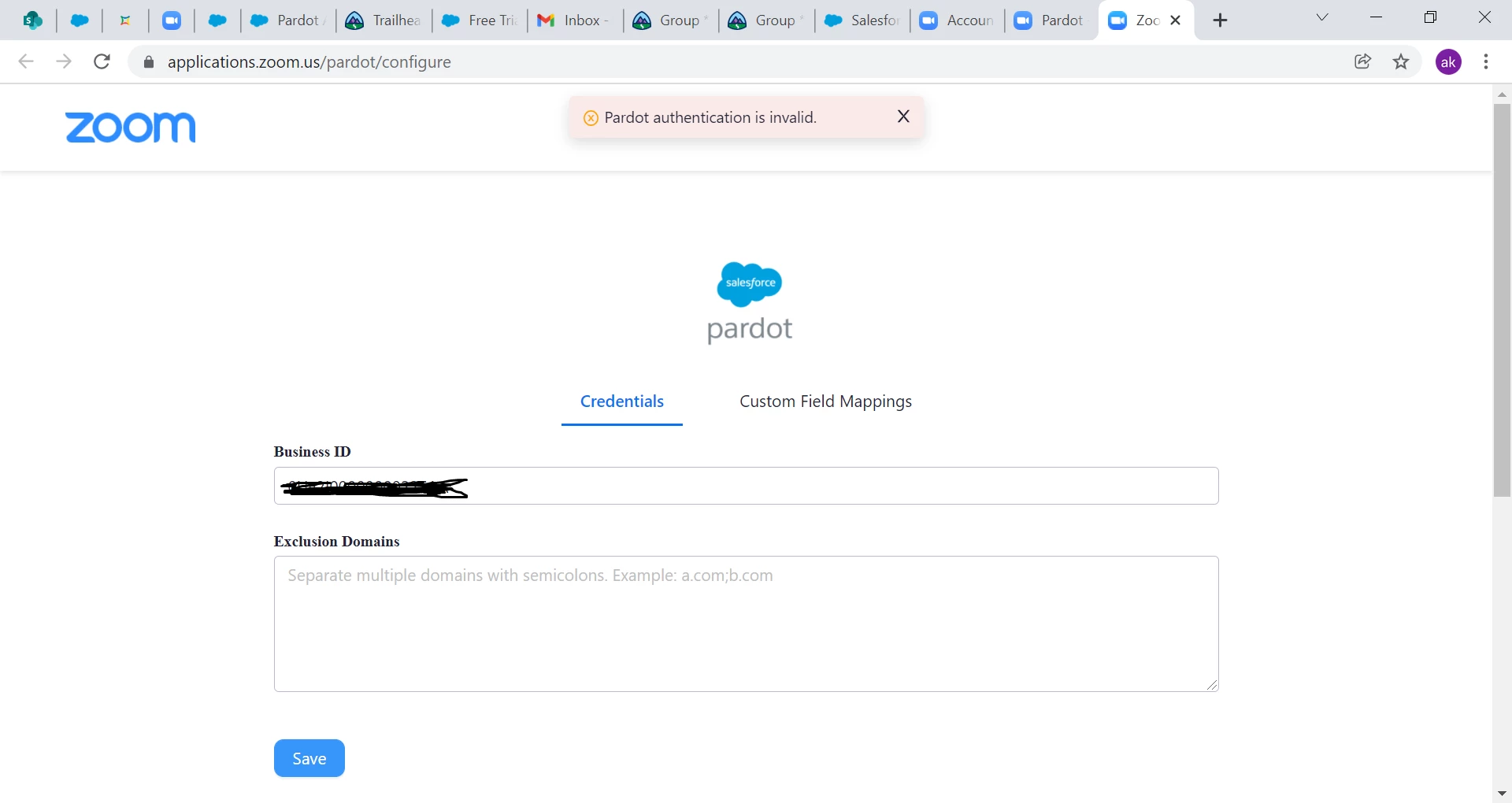 AakshathaNewcomerForum|Forum|4 years agoJanuary 19, 2022QuestionPardot integration with ZoomForum|Forum|4 years agoJanuary 19, 20223 replies3 viewsI am trying to integrate Zoom with salesforce pardot and followed all the steps and checked the setting in the salesforce. All are correct but at the "authorize" i am getting "pardot authentication is not valid". Kindly help.