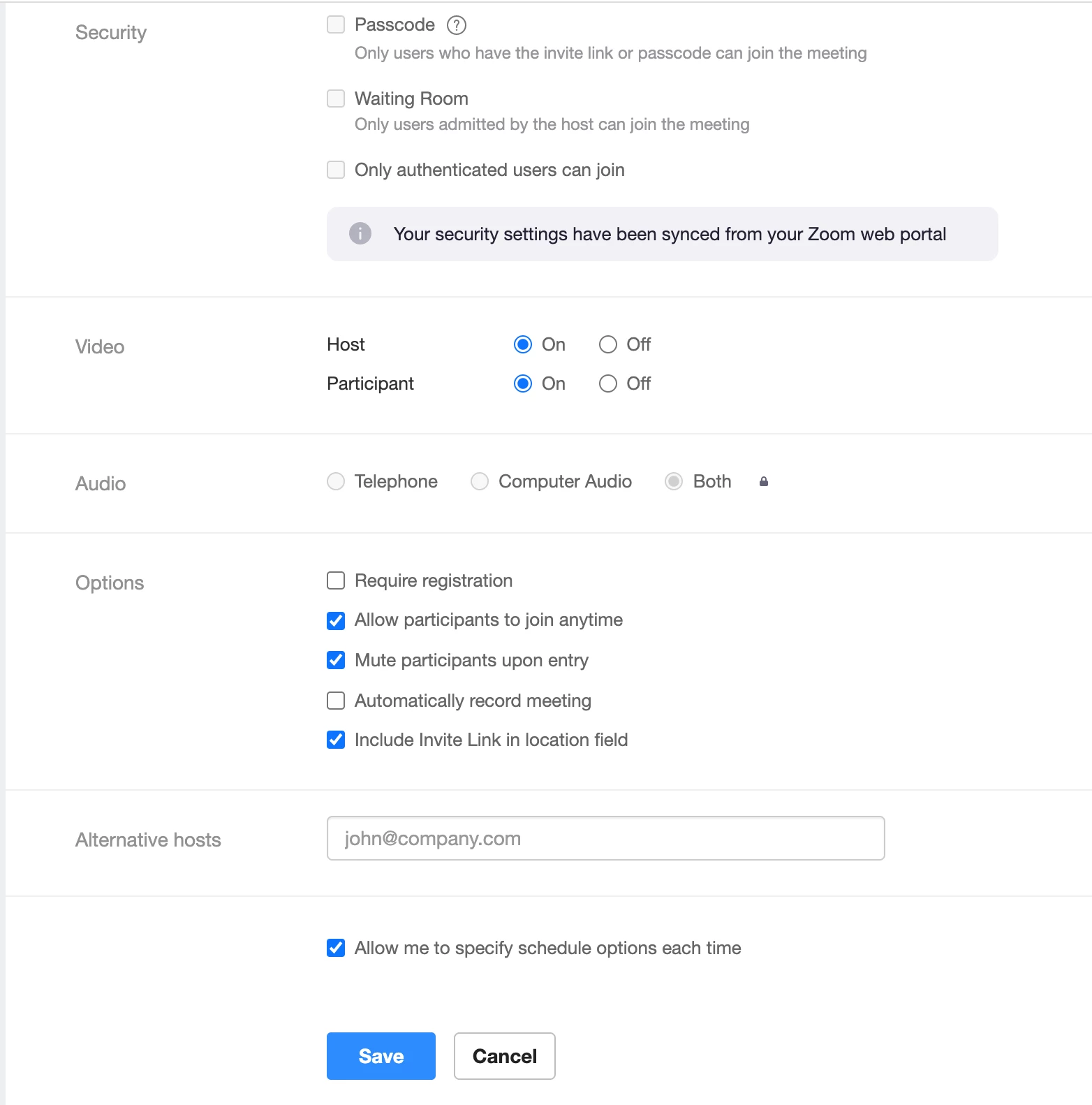 "Schedule For" is not available because Shared Access Permissions is not enabled. Click here to visit Zoom Marketplace and enable "Allow this app to use my shared access permissions"for the Google Workspace app from the Shared Access Permissions column.