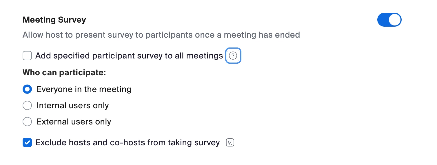 Hi - I'm trying to utilize a 3rd party survey link for meetings and I believed the setting was disabled by our IT team. However, when our IT team looked into it, they said that the 3rd party survey toggle was visible for a few days while they investigated in early January, but then disappeared from their settings at the end of January. They shared a screenshot with me that shows a box that says "Hosts will no longer be able to use 3rd-party survey links in newly and previously scheduled meetings."