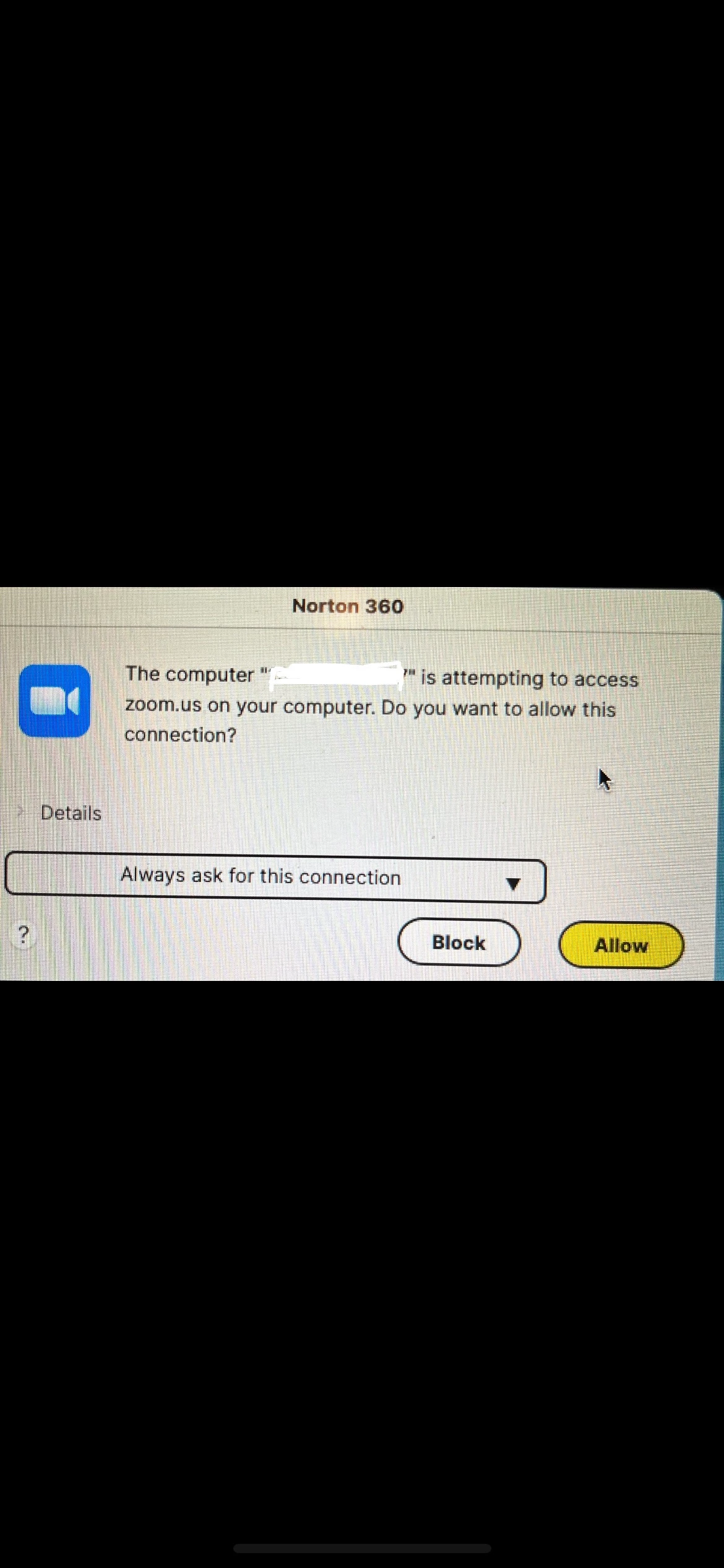 During a meeting I had an unstable internet connection for a while. The video froze a few times. Then a message popped up on the screen - see photo - Saying: "The computer " ***.***.**.*** " is attempting to access zoom.us on your computer. Do you want to allow this connection?"