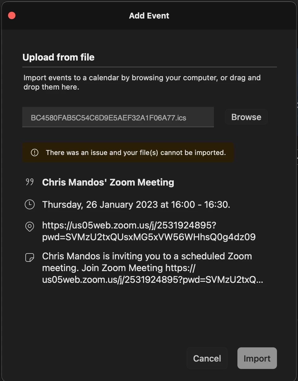 CChrisMandosNewcomerForum|Forum|3 years agoJanuary 26, 2023QuestionAdd Event ErrorForum|Forum|3 years agoJanuary 26, 20231 reply1 viewHello, Would anyone be able to advise or assist in why I am getting this error screen after trying to ad an event/meeting?I am running on a MacOS Monterey (also as per screen shot), I would appreciate it very kindly, Thank you Chris