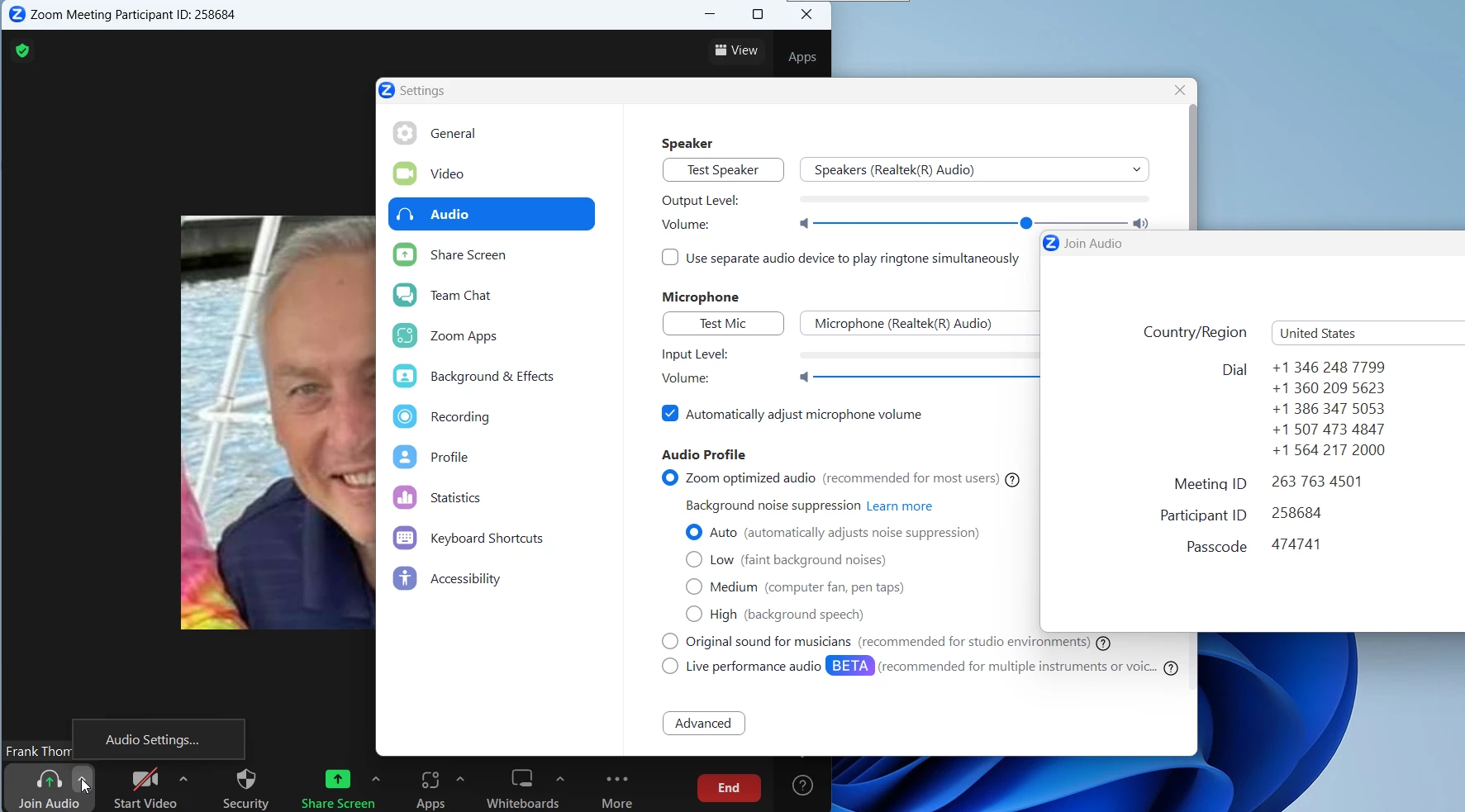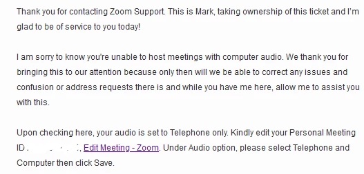 Then closed the meeting and another person started a new meeting with their ID and that meeting had normal audio.