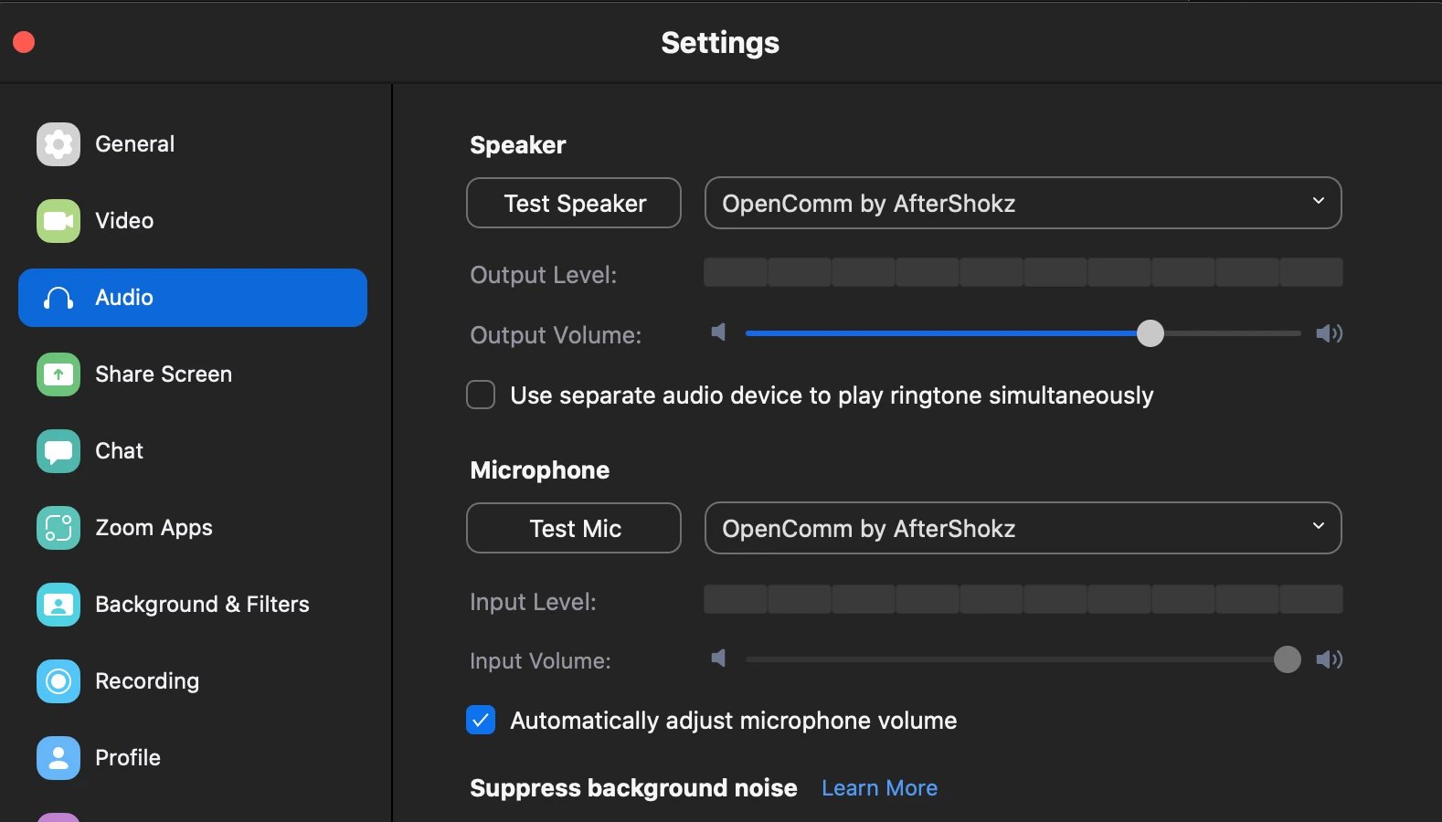 - Speaker: "OpenComm by AfterShokz" (also tried same as system)
