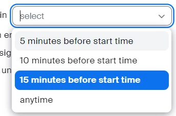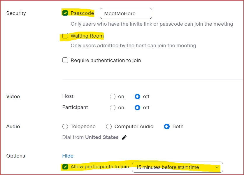 • Allow participants to join before start time must be enabled, and I recommend not using the anytime option, since that means anyone with the link can join it literally any time.  Other options are shown here: