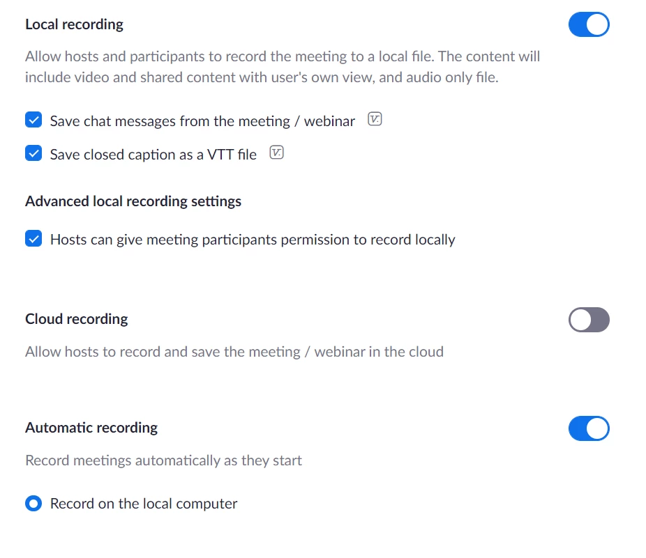 Next, please check your Recording Settings – especially the default location for where your recordings will be saved. And be sure there is plenty of available space on the designated drive. https://support.zoom.us/hc/en-us/articles/201362623