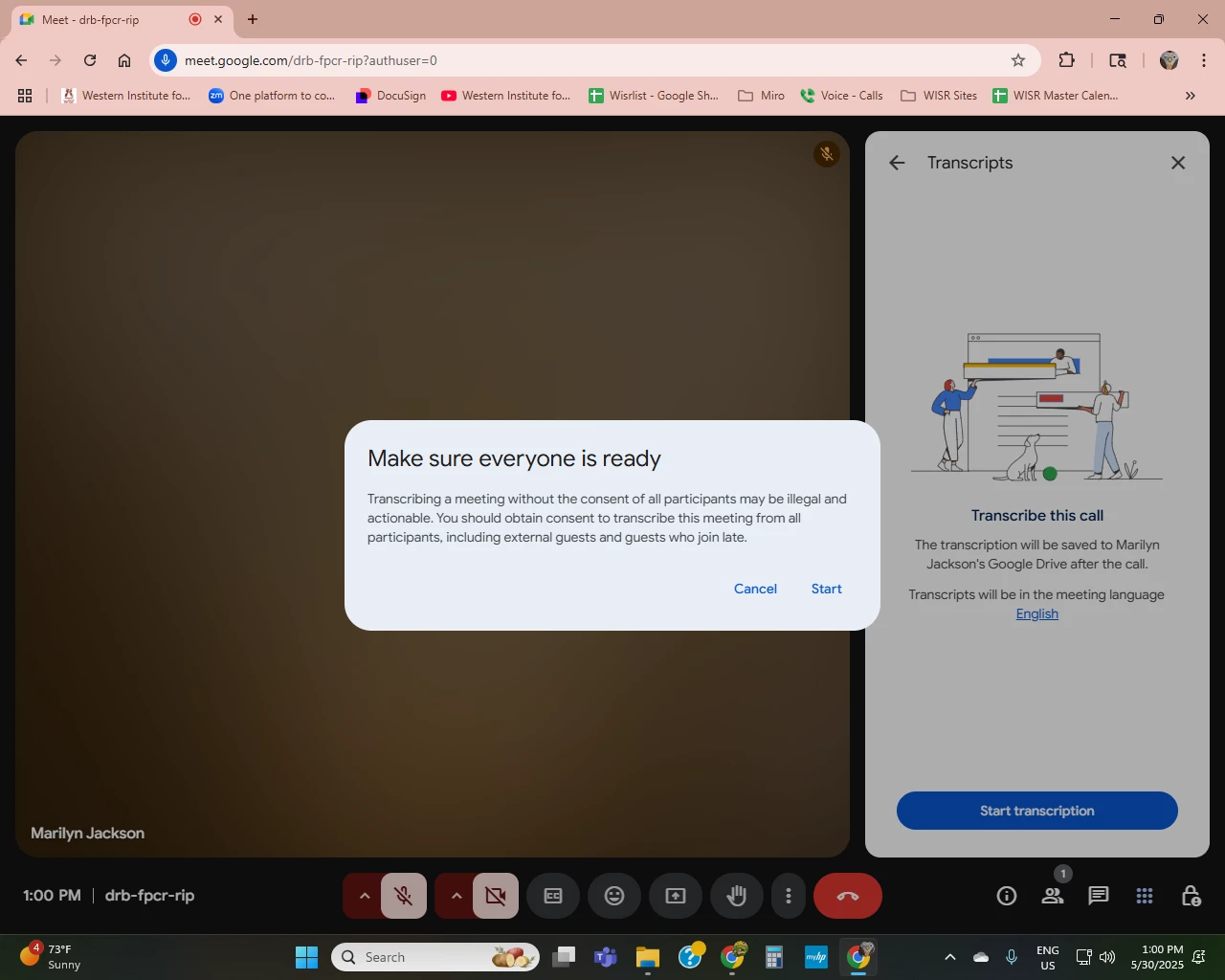 Google Meet handles this concern about legality by posting this statement below, just fyi. I suppose when you record, people will know that. People should know if you are keeping a transcript. However you can do it--you just have to press save yourself.