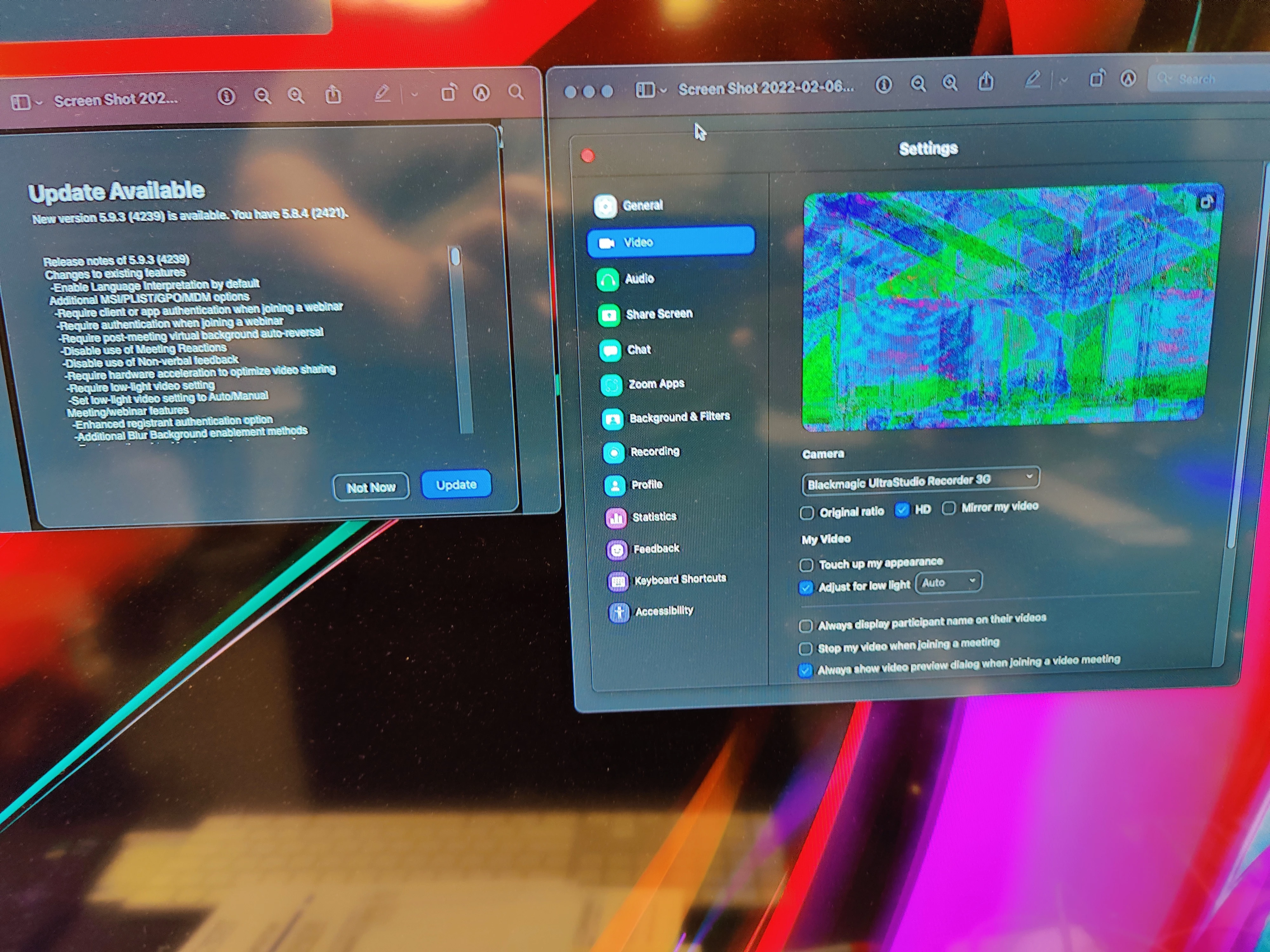 I have been using a Blackmagic Ultrastudio Mini Recorder to connect a Nikon D750 successfully with Zoom on a 2019 Intel MacBook Pro for over a year. Current software is Monterey 12.1. All was fine. However, after updating to Zoom 5.9 and 5.9.1 I no longer have connectivity. Blackmagic Ultrastudio Mini Recorder still shows in the available cameras, but no longer has available video. Only show a black screen.