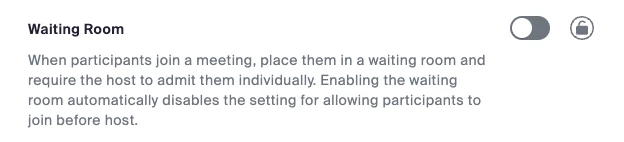 But then, I went to Zoom.us and as you can see, the Security Setting is grayed out and has overridden the meeting setting and required it be secured, and defaulted to the waiting room.