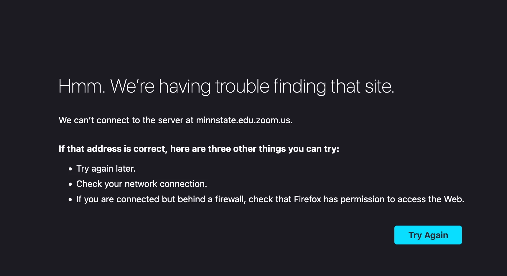 I would double-check the zoom vanity URL. "minnstate.edu.zoom.us" isn't a recognized format for a Zoom meeting site. I would try "https://minnstate.zoom.us" instead.