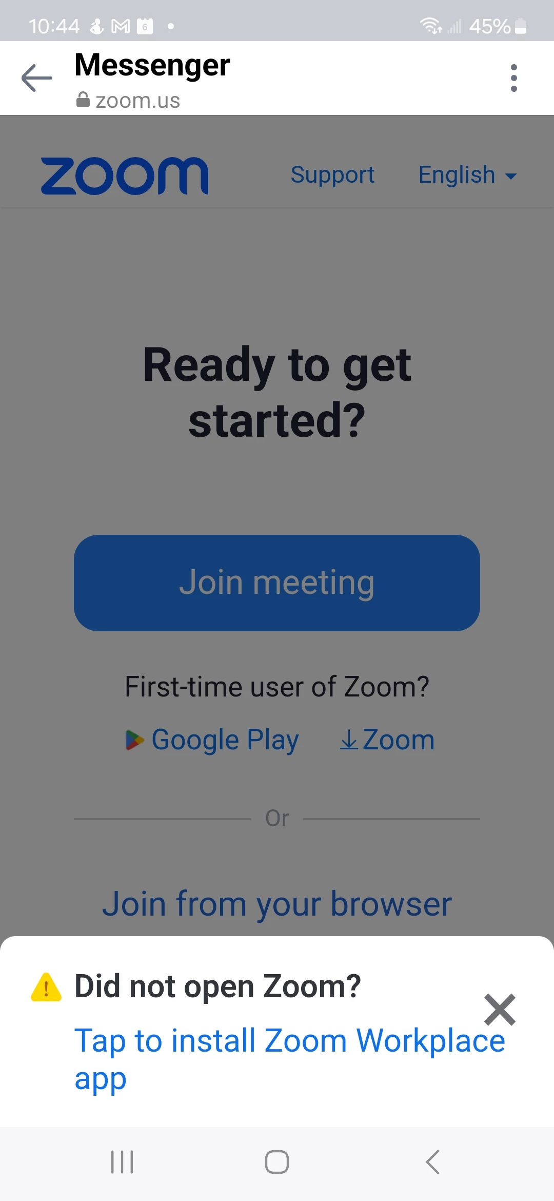EEllieWNewcomerForum|Forum|1 year agoNovember 6, 2024QuestionCan't connect to meeting with link on mobileForum|Forum|1 year agoNovember 6, 20240 replies0 viewsI started a zoom - sent myself a link to that meeting to also join with my mobile. When I click the link - it's telling me to install Zoom. I already have Zoom on my phone and it is updated ???Other