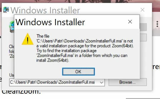 When I try to run CleanZoom (so that I can upgrade from 5.13.11216 to the current version), I receive an error message saying that it can't find the ZoomInstallerFull.msi. I downloaded the file from Zoom, rerun CleanZoom (giving it the path to the .msi file), and received the message (seen in the image) saying that ZoomInstallerFull.msi is not a valid installation package for the product Zoom(64bit).