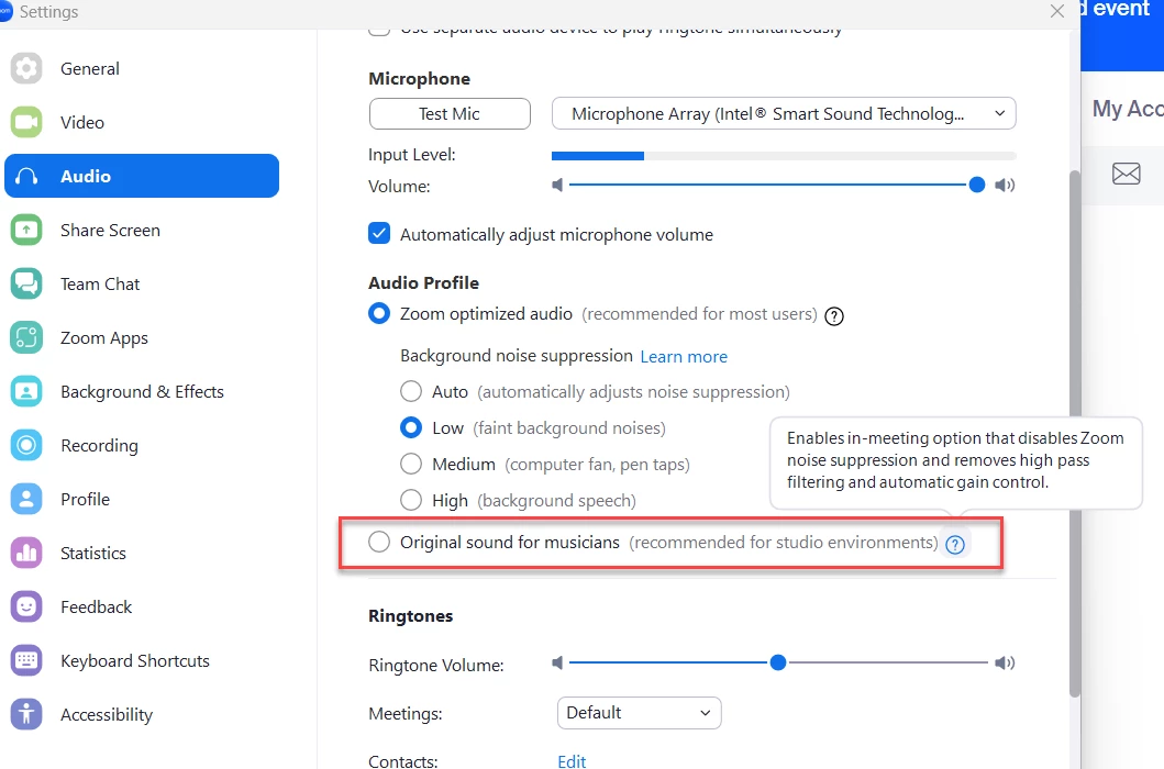 I just got a new computer, Windows 11 and cannot switch off the background noise suppression in audio settings. This means that when I use a meditation gong for group meetings, the gong cannot be heard. I tried music settings, original sound etc, but nothing works.