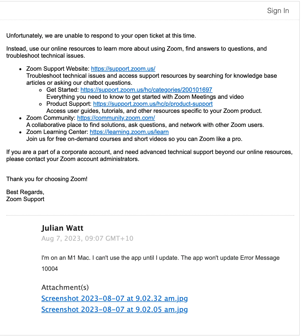 When I tried to join a meeting today from an invitation, Zoom tells me to update. I click "ok" the update, but the update comes back with an error and won't update Zoom. I am using an M1 Mac with an up-to-date OS. I am stuck. Please help.