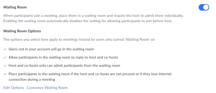 I host a recurring meeting, but I’m sick and need to cancel. I don’t have regular registrants, so is there a way to let people know the meeting is cancelled when they attempt to log in? Is there a way to leave a message in a waiting room about a cancellation?