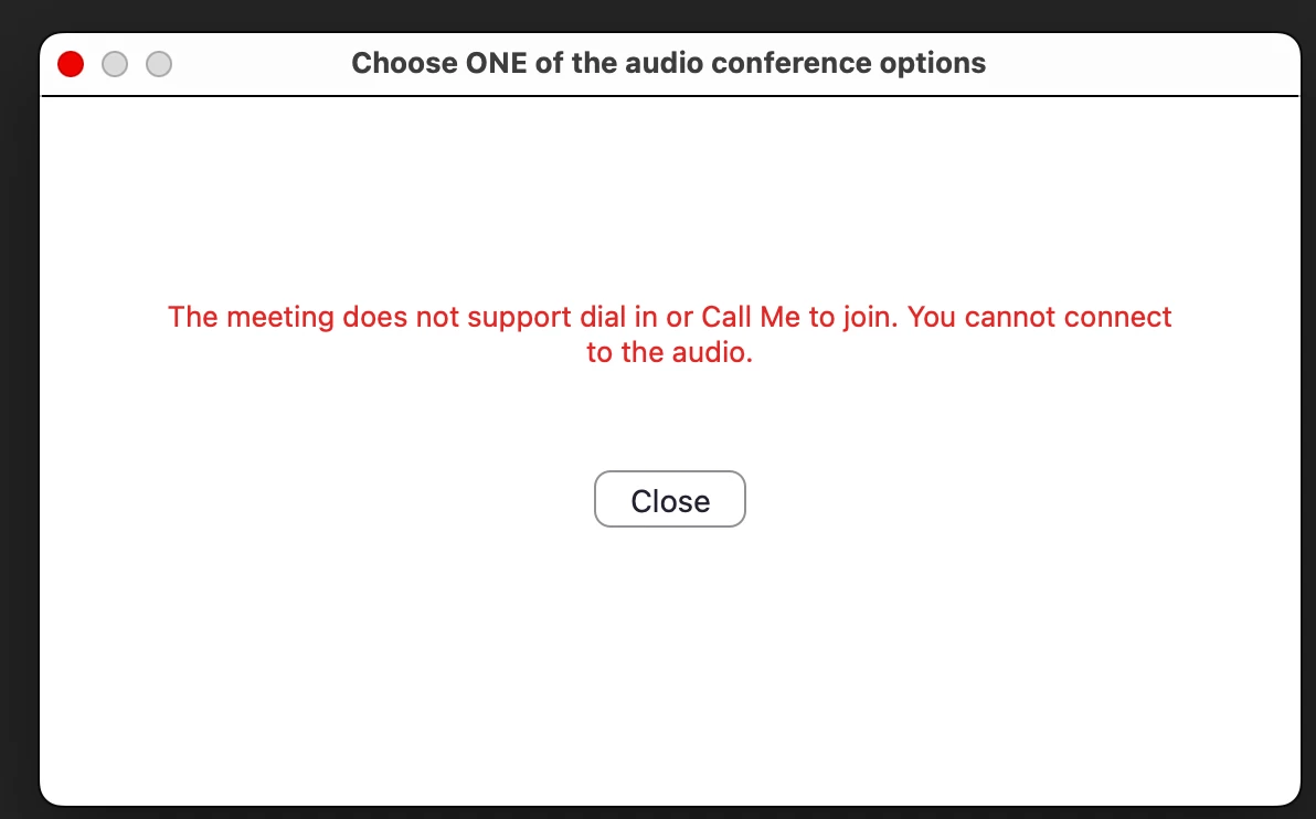 I cannot connect to the audio when starting my own meeting, for both myself and my guests. The mic and speaker tested fine.   I am using my MacBook and the audio type under the setting is set to use computer audio. The usual mute/unmute button disappeared and was replaced with "Join Audio" on the bottom of my screen.  Upon click, it says "The meeting does not support dial in or Call Me to join. You cannot connect to the audio."    I have never had this issue before until I changed my passcode for the meeting.  Also in my setting I wasn't able to change the passcode anymore because it's "Locked by admin".  I thought I am the admin of my own account.