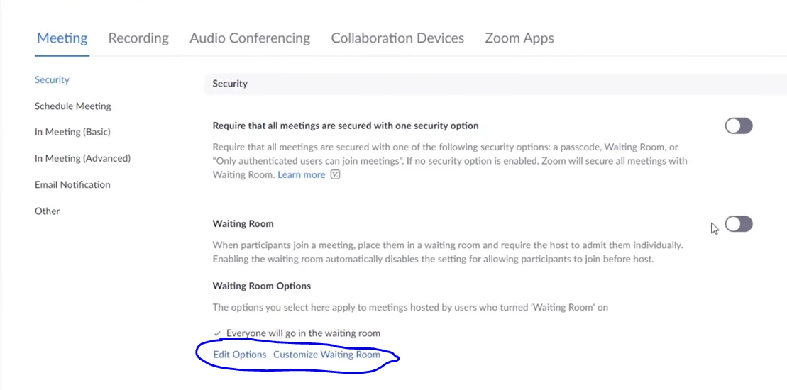 Currently I am using zoom free version and when I want to change the waiting room setting on the setting page, I cannot find the Editing options :
