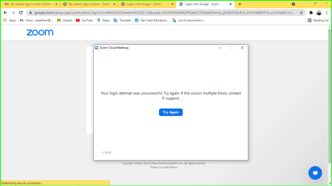 i cannot sign in my account if i type my username and password it says errors and if i click google sign in it say please ccall for IT suppert this problem makes me sad please solve this issue as soon as possible.