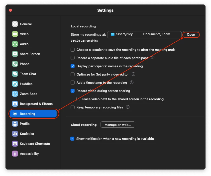 From here, click "Recording" on the left-hand side and click "open" as to where you'd like your local recordings to be stored.